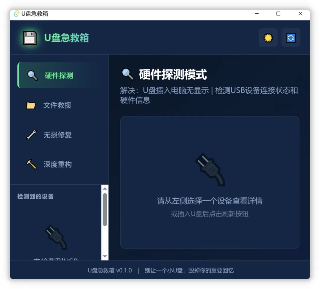 “U盘急救箱”这款工具,主要用于解决U盘出现文件系统错误时的数据抢救和修复问题,避免因误操作导致数据丢失。