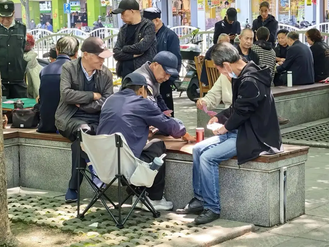驻足细看,这群老人里,既有土生土长的城镇退休职工,也有安居本地的进城新市民。日复一日,晴日相聚、休闲小坐,早已成了他们晚年生活的固定习惯。