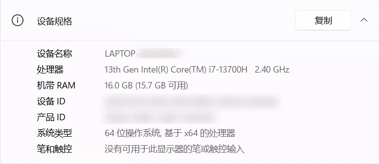 如图,可以看到我的处理器是13th Gen Intel(R) Core(TM) i7-13700H 2.40 GHz。字段含义分别是: