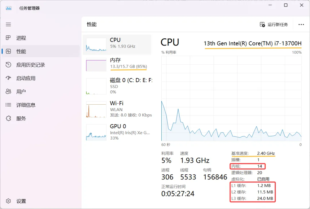 如图,我电脑的CPU核心数为14个,即CPU内部有14个独立的处理单元。L1、L2、L3三级缓存的容量也一目了然。