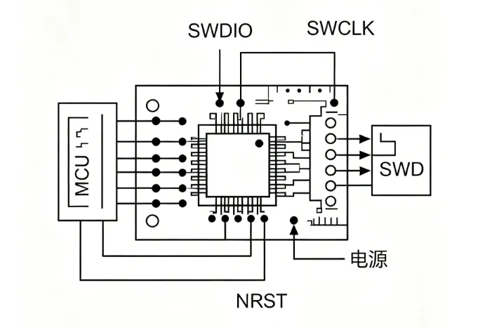 硬件层面是最常见的诱因:芯片电源与地管脚短路、焊盘虚焊、漏焊,会直接导致芯片无法正常上电运行;SWDIO、SWCLK 调试引脚接反,或是引脚被程序复用为普通 IO 功能,会造成调试功能无法使用。同时,SWD 下载线束过长、接头松动接触不良、调试速率设置过高,也会造成通信不稳定,进而识别不到芯片。除此之外,芯片管脚电平与 SWD 调试电平不匹配、板载电源纹波过大、NRST 复位引脚受干扰异常,都会造成调试通信异常。