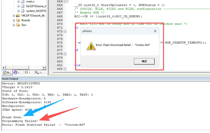 若调试器能够正常读取芯片信息,却在 Flash 烧录阶段报错、下载中断,就属于下载失败问题,排查逻辑更聚焦配置与烧录限制。