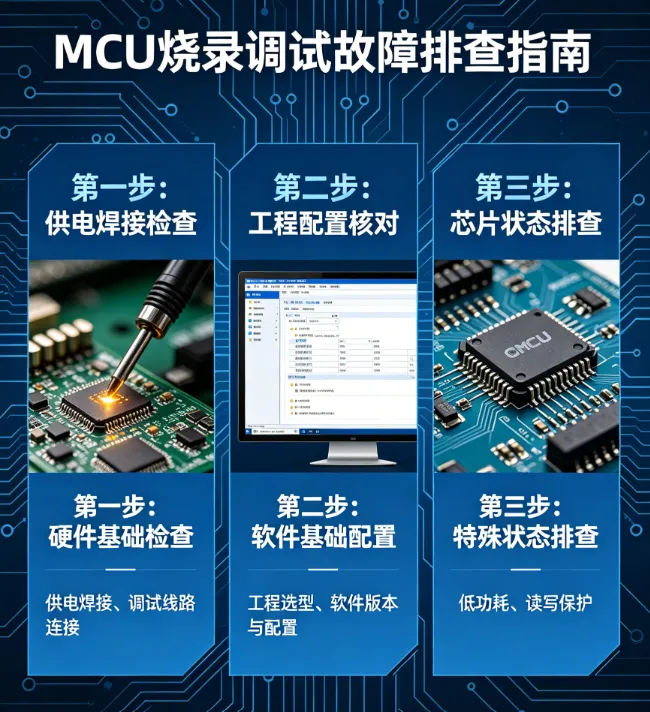 MCU 烧录调试故障排查,建议遵循先硬件后软件、先基础配置后芯片状态的顺序。优先检查供电焊接、调试线路连接,再核对工程选型、软件版本与配置,最后排查芯片低功耗、读写保护等特殊状态。