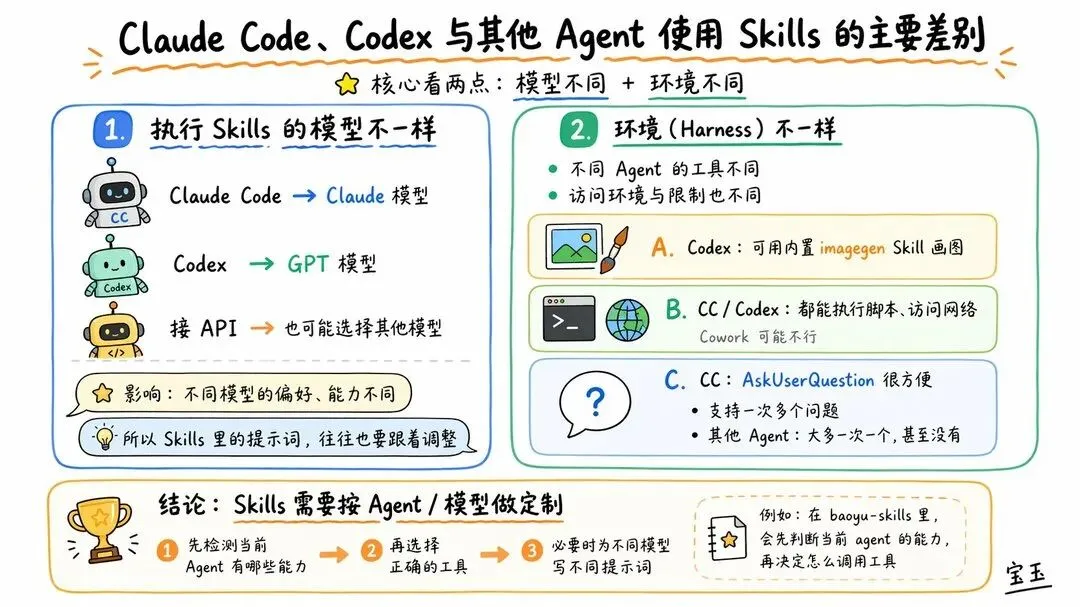 CC 会用 Claude 模型,Codex 会用 GPT 模型,如果接 API 可能还会选择其他模型;不同模型的偏好和能力不一样,所以 Skills 里面的提示词也会有差异