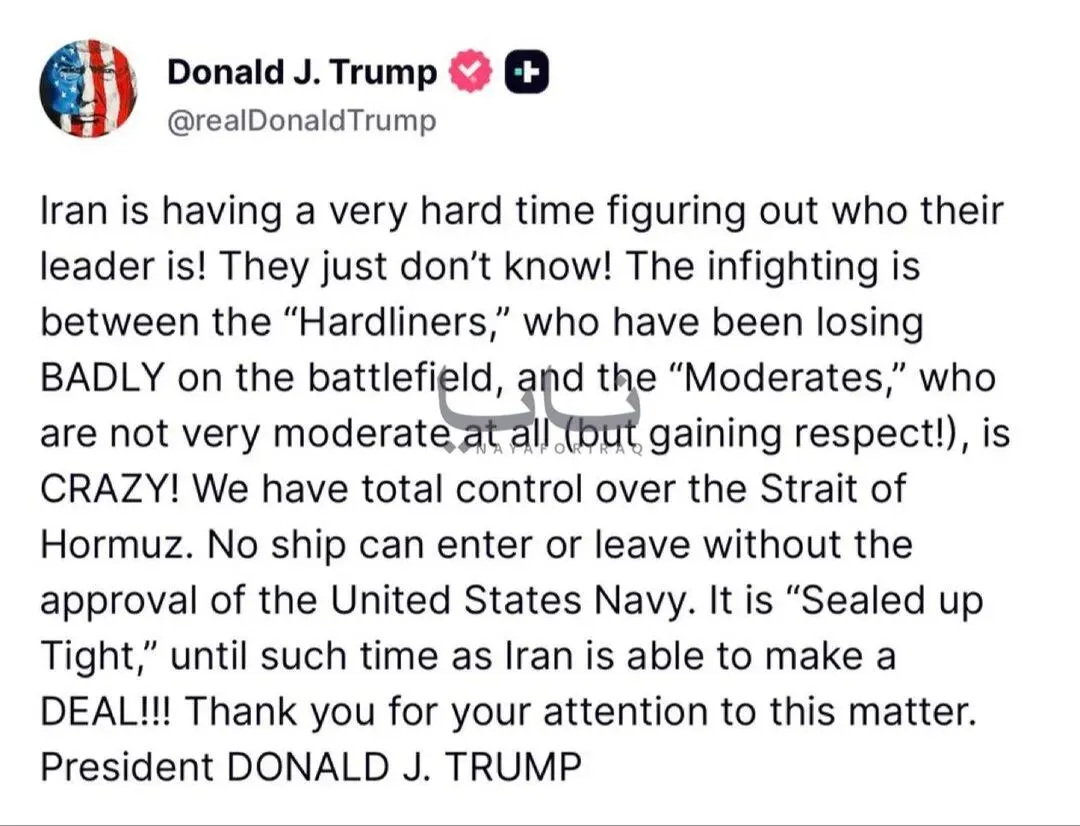 🔻特朗普:“伊朗正为确定其领导人而陷入极大困境!他们就是搞不清楚!战场上一败涂地的“强硬派”与其实一点也不温和(但正赢得尊重!)的“温和派”之间的内斗简直疯狂!我们完全掌控着霍尔木兹海峡。未经美国海军批准,任何船只都无法进出。在伊朗能够达成协议之前,海峡将“严密封锁”!!!感谢各位对此事的关注。唐纳德·J·特朗普总统。”