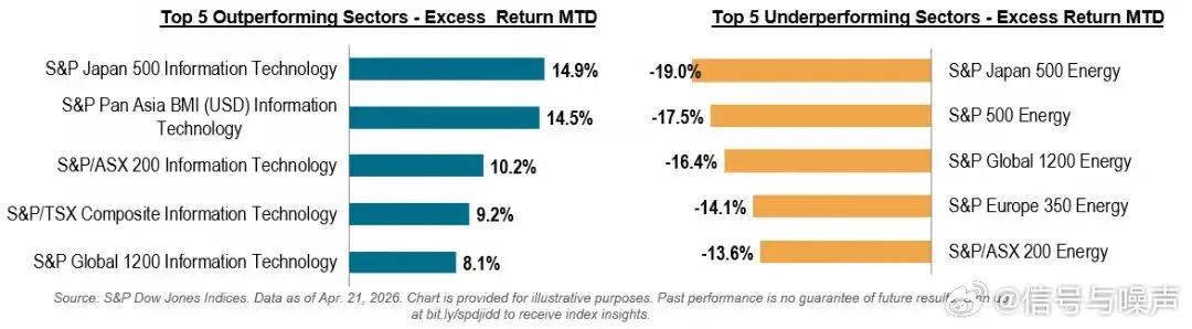 信息技术板块本月迄今的领跑地位,以及能源板块的疲软,并非仅限于美国市场,而是反映了全球趋势