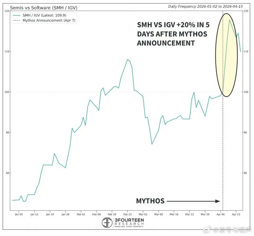 这是2026年AI叙事最重要的一次内部重塑:”AI应用层受益”让位于”AI算力基础设施主导”。半导体vs软件的分化,在Mythos之后具备了远超之前更坚实的结构性基础。