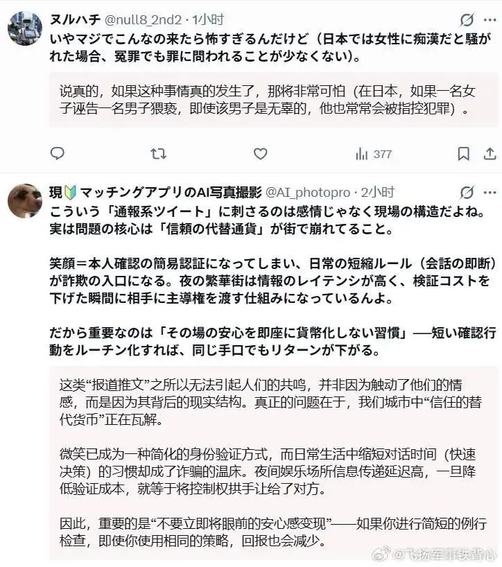 🔻从后面日本人的回帖看,她可能是通过大喊大叫、动手来制造一种被目标“猥亵”的假象——因为在日本被以“猥亵”报警的话会很麻烦。