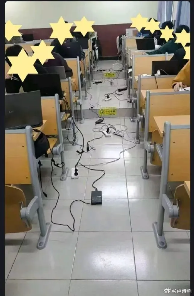 最后,老师没办法,去男生考场那边均出了五个接线板,给女生这边用。