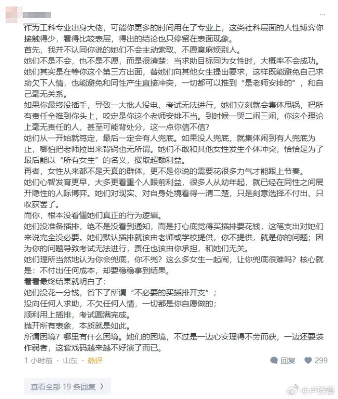 接线板不够,女厕不够,那是学校不作为,社会保障不到位啊,明明是一个社会的问题,凭什么要求女性付出呢?这显然是一种压迫。
