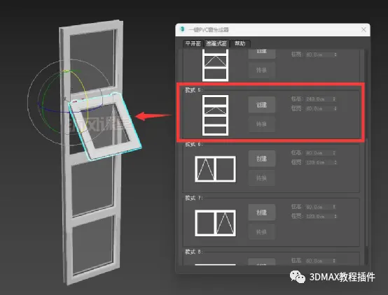 2.打开一键PVC窗生成器插件,选择窗户分类标签(平开窗、遮篷式窗),然后,在分类下面选择窗的样式(当前有2类16种窗户样式可供选择),点击样式右边的“创建”按钮,创建。