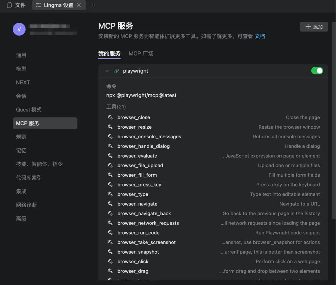 我们只需在通义灵码的 MCP 市场中搜索 “playwright” 并添加。添加成功后,你会看到它提供了丰富的工具,比如 browser_navigate (打开网页)、browser_fill_form (填写表单)、browser_click (点击) 等等。