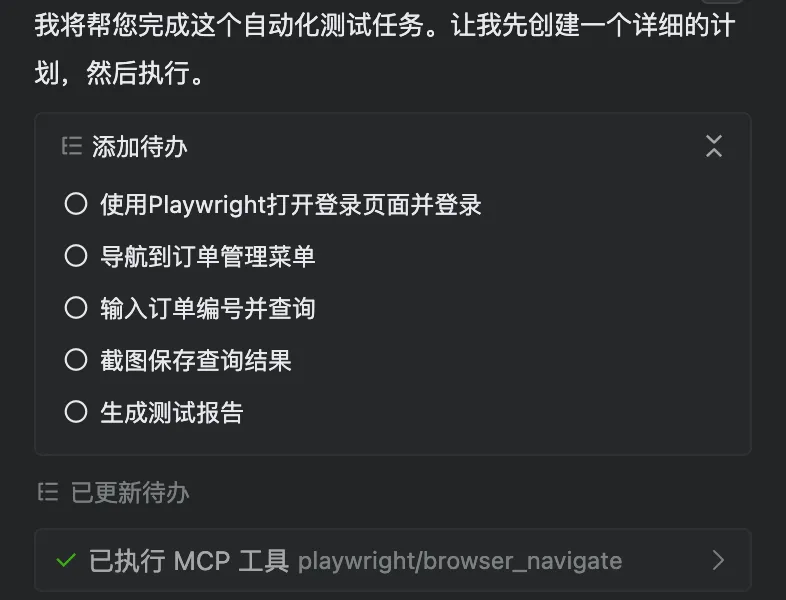 AI 会先执行这些后台操作,将获取到的 order_id 暂存为变量,然后在随后的 Playwright 浏览器操作中,自动填入这个 ID 进行搜索。这就实现了 “数据驱动 UI 测试” ,完全摆脱了手工造数的烦恼。