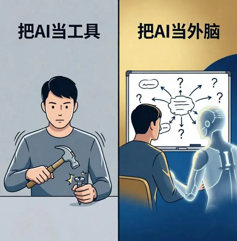 行为: 不是问AI”答案是什么”,而是问AI”我的思考有什么问题”。这一个问法的改变,就是从工具用法到外脑用法的核心转变。