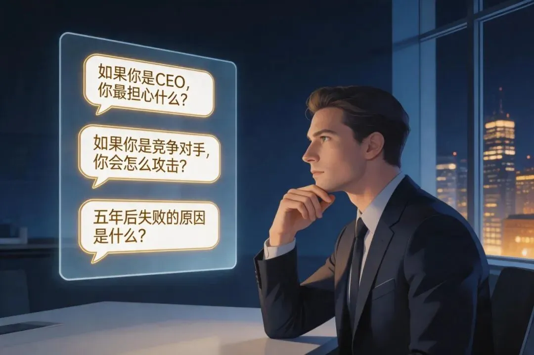 AI不只是给你一份报告,它会质疑你的假设:你说的”核心能力匹配”,具体是哪些能力匹配?你有没有验证过这个匹配是真实的,还是你的主观判断?你说竞争格局没有形成垄断,但有没有可能有隐形的竞争壁垒你没有看到?