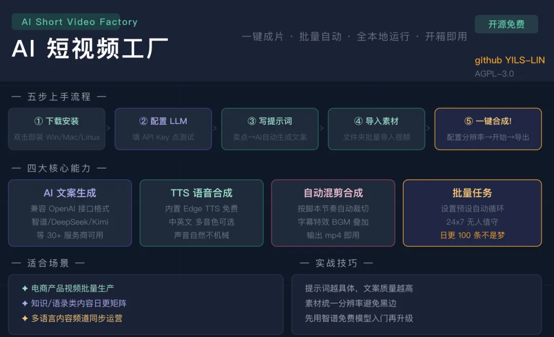 老实说,我刚看到的时候是将信将疑的——市面上吹”一键出片”的工具太多了,大多数要么效果一般,要么配置极复杂。但这个是开源的,代码全公开,社区评价也不错,我决定亲自试一试,写下这篇首次体验全记录。