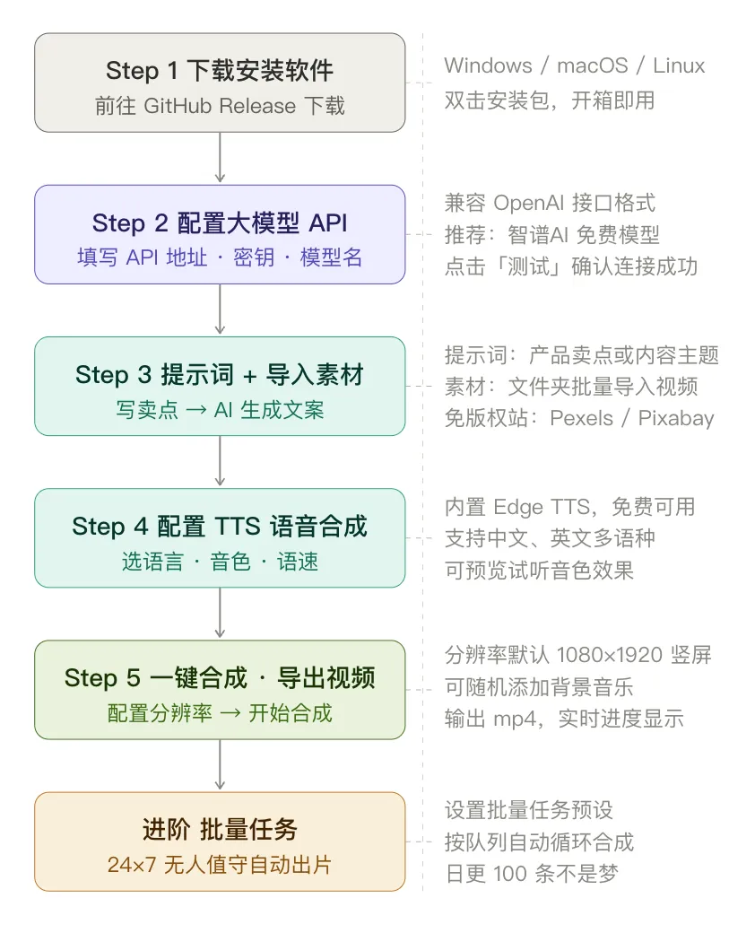 软件开始工作:调用大模型生成文案 → 调用 TTS 合成语音 → 按脚本节奏混剪视频素材 → 添加字幕和特效 → 导出 mp4。