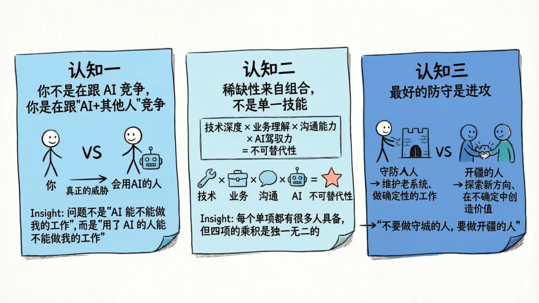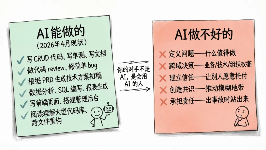 代码 AI 能写,方案 AI 能拟,文档 AI 能生成。但“这件事值不值得做”、“该投多少资源”、“怎么让十个团队对齐”——这些判断和行动,是你当下最现实的护城河。
