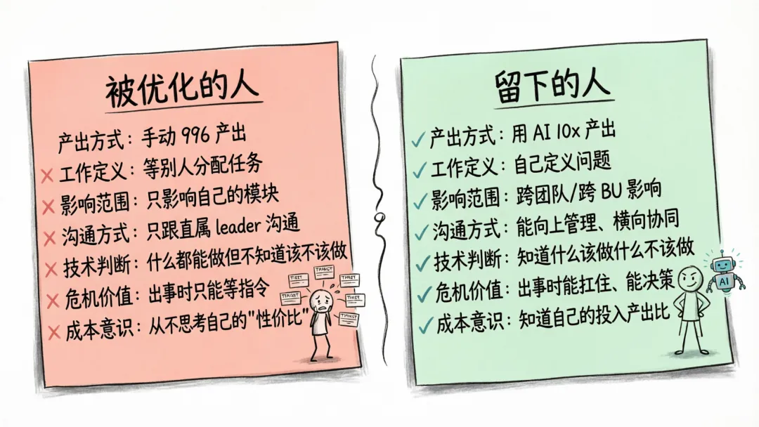 过去一个 P8 带 10 个人的团队,现在 AI 让 P8 觉得 5 个人就够了。但 HC 砍掉之后,剩下 5 个人的工作量不会减半,而是每个人被期望干两个人的活。你不是被 AI 替代了,你是被“AI + 同事”的组合替代了。