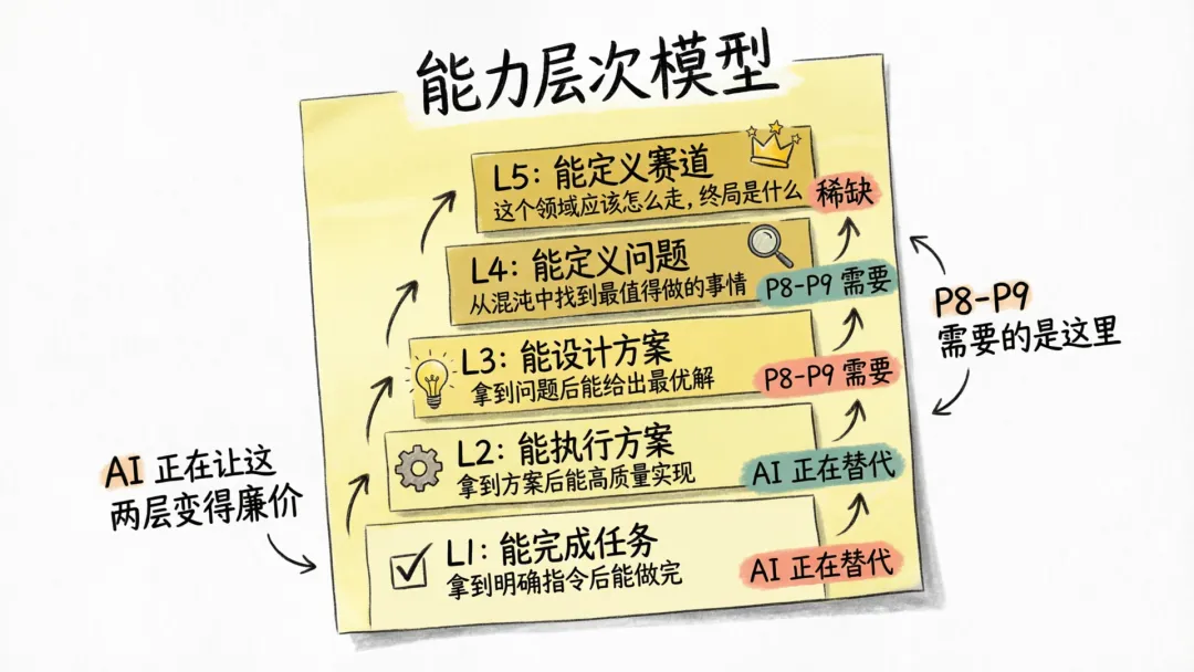 AI 正在让 L1-L2 变得廉价。P8-P9 需要的是 L3-L5 的人。