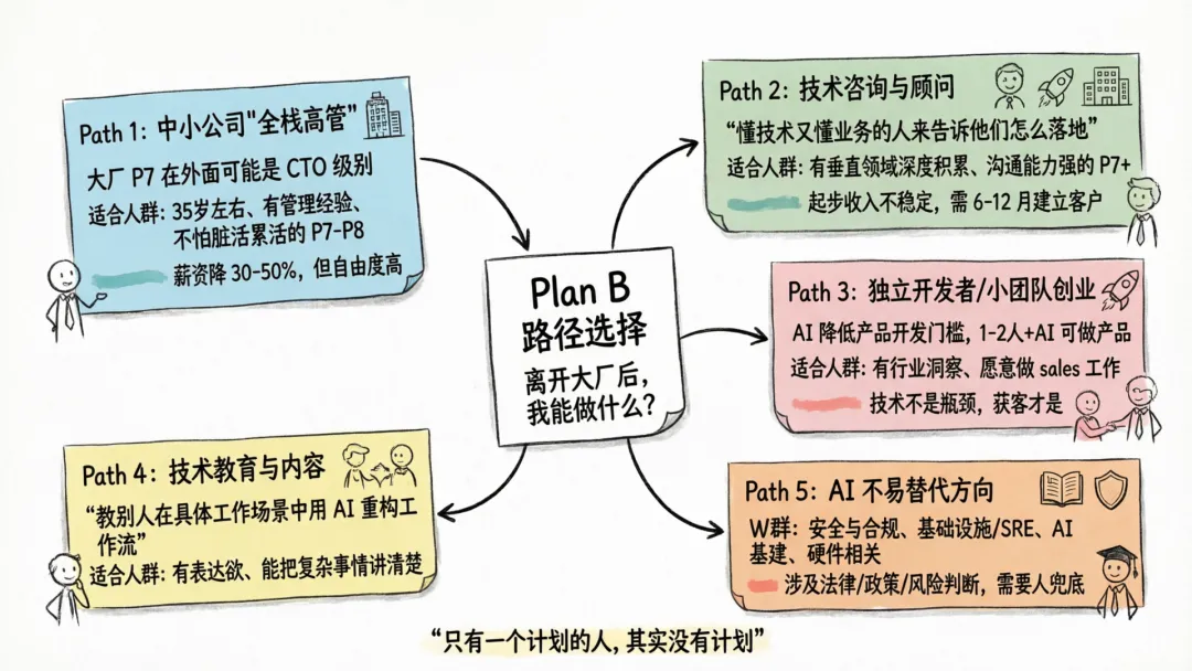 在 AI 重构行业的这几年里,很多人会发现:他们在大厂体系里积累的能力、人脉、视野,在体系外可能有完全不同的、甚至更大的价值。一个在蚂蚁做了 5 年风控的 P7,去金融科技创业公司可能是 VP 级别的角色。一个做了 8 年基建的 P8,做技术咨询的时薪可能是大厂时薪的 3 倍。