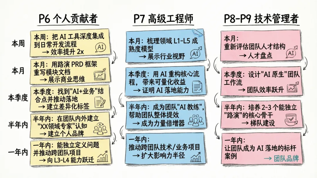 “能拿得住方案”:AI 生成的方案质量在快速提升,一个用好 AI 的 P6 出的方案可能不比 P7 差。 -