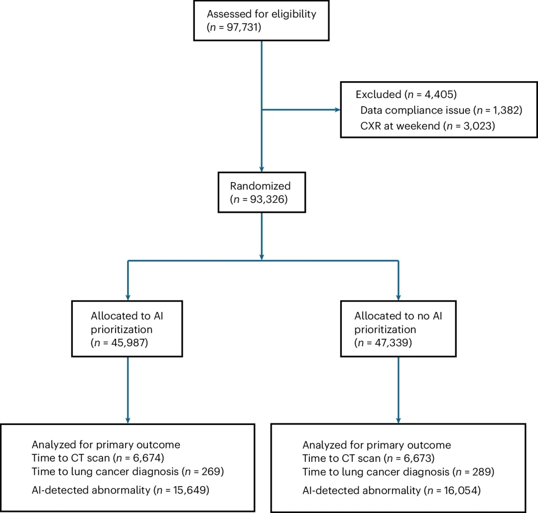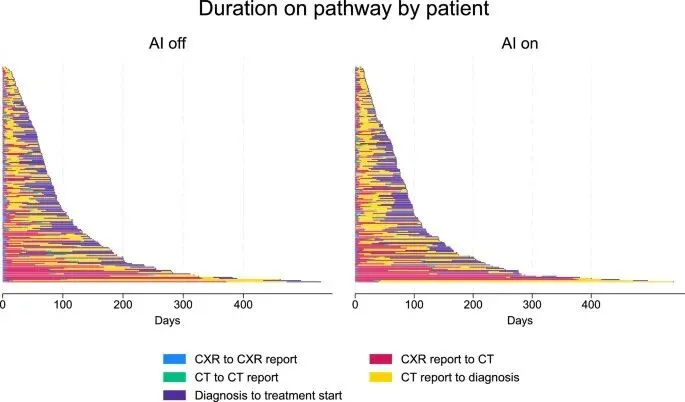 研究以胸部X光检查为场景,设置了两组对照:一组采用AI识别异常影像并优先排序病例,另一组沿用传统人工排序方式,核心观测从X光检查到CT检查、再到肺癌确诊的时间间隔,直击“AI能否真正改变诊疗结果”的核心问题。