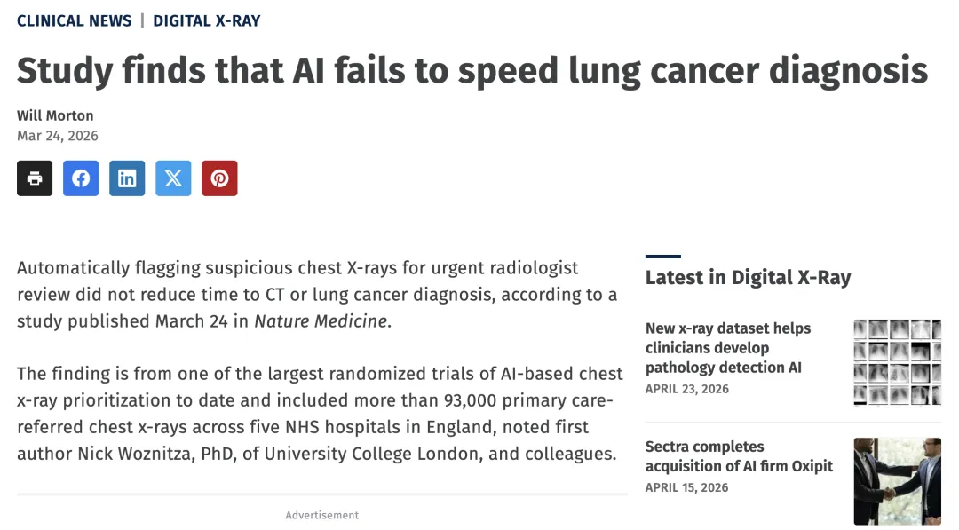 但2026年3月发表于《Nature Medicine》的一项前瞻性、多中心随机对照试验,却给出了颠覆认知的结论:AI确实让读片速度变快了,可肺癌患者的确诊时间,并没有因此提前[1]。
