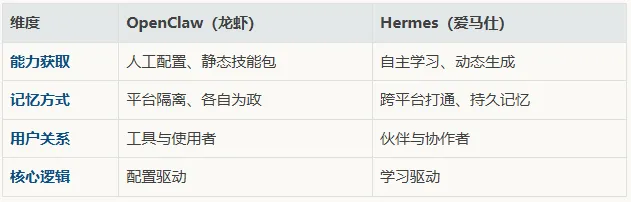 ClawHub上有1.3万+现成的技能包——你不需要从零开始,有人已经写好了。但问题是:这些技能是静态的。安装的那一刻,能力就固定了。遇到新场景,你还得回去找新技能、或者自己写。Hermes的逻辑完全相反:它的技能是动态生长的。每完成一次任务,它都在进化。用的人越多,它越聪明。这不再是”功能比拼”,而是”进化能力比拼”。