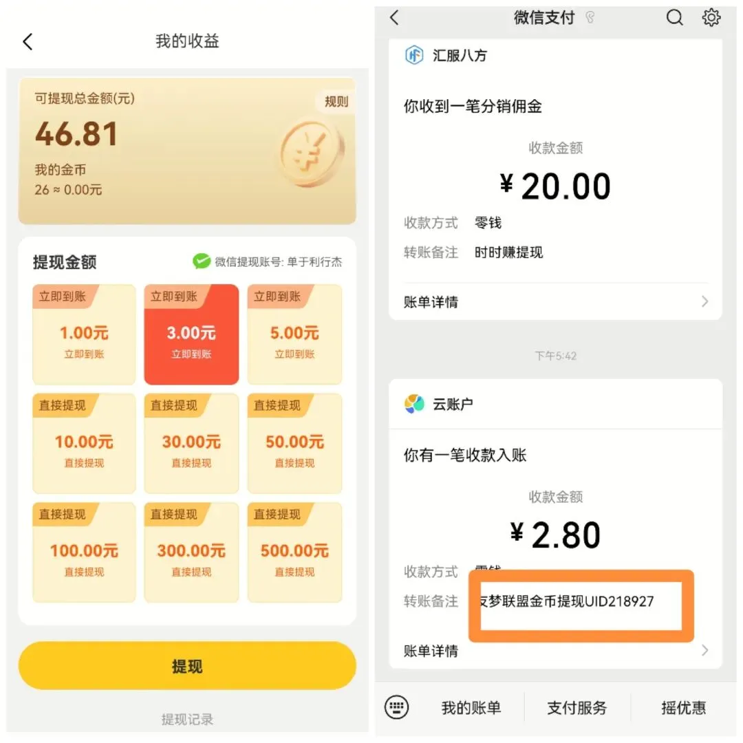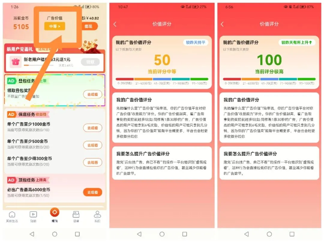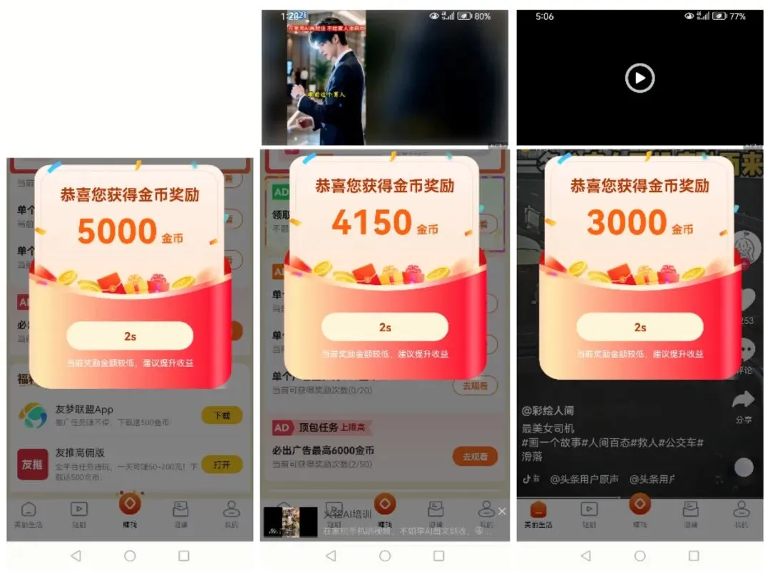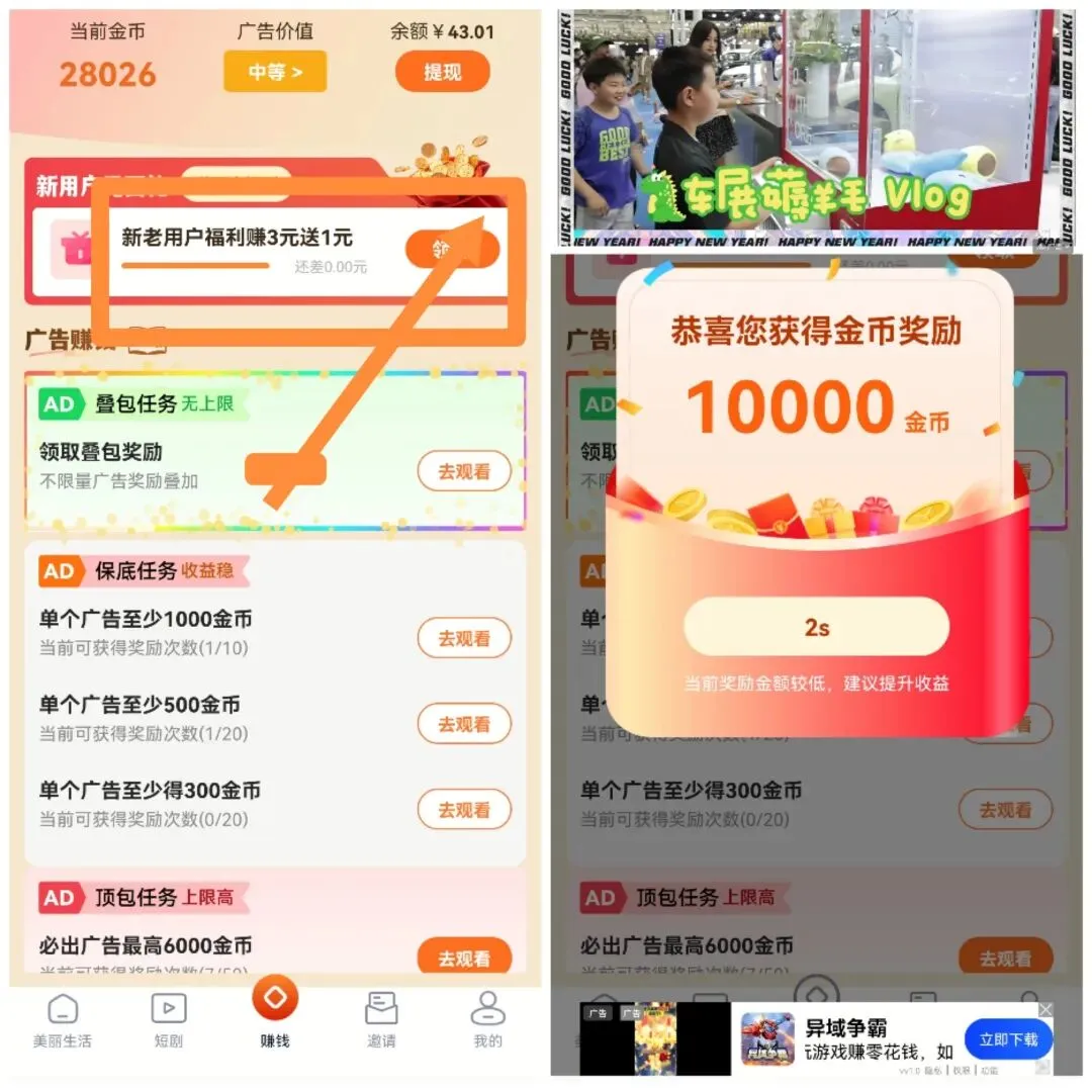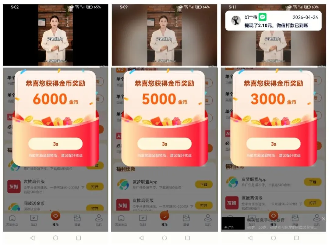 我依然拿手机权重高的试了二天,先看一下金币数据截图吧!第一天先撸了6元,第二天30个广告左右撸了11元。