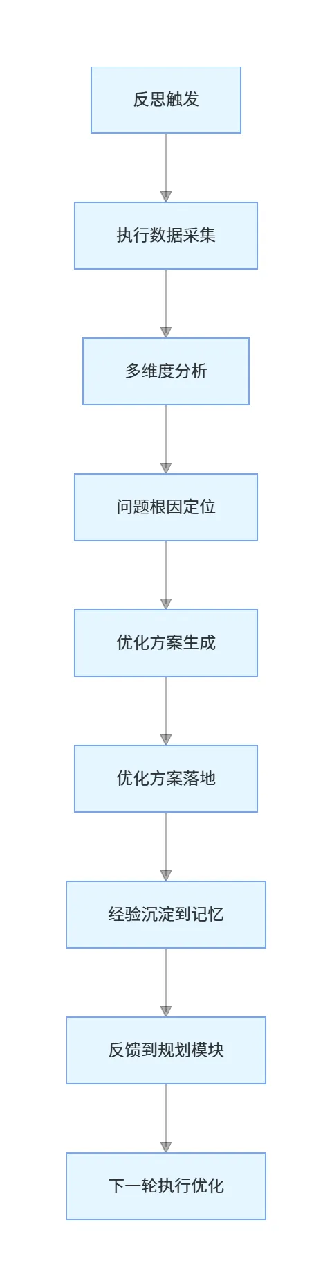 每一步动作执行完成后,反思模块会根据执行结果,判断是否需要触发单步反思,分析执行过程中的问题,生成优化方案,沉淀经验到记忆模块,同时反馈给规划模块,优化后续的执行计划。 -