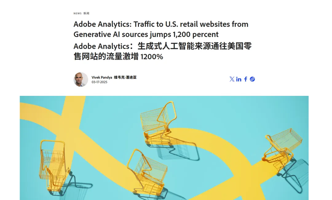 这不是假设场景,这是海外权威机构Adobe Analytics 在2025年3月份公布的最新数据,截止2025年3月份全球用户通过AI助手进入电商、零售、B端网站的流量同比增长了1200%,直接向AI提问已经成为获取产品推荐的主流方式之一。