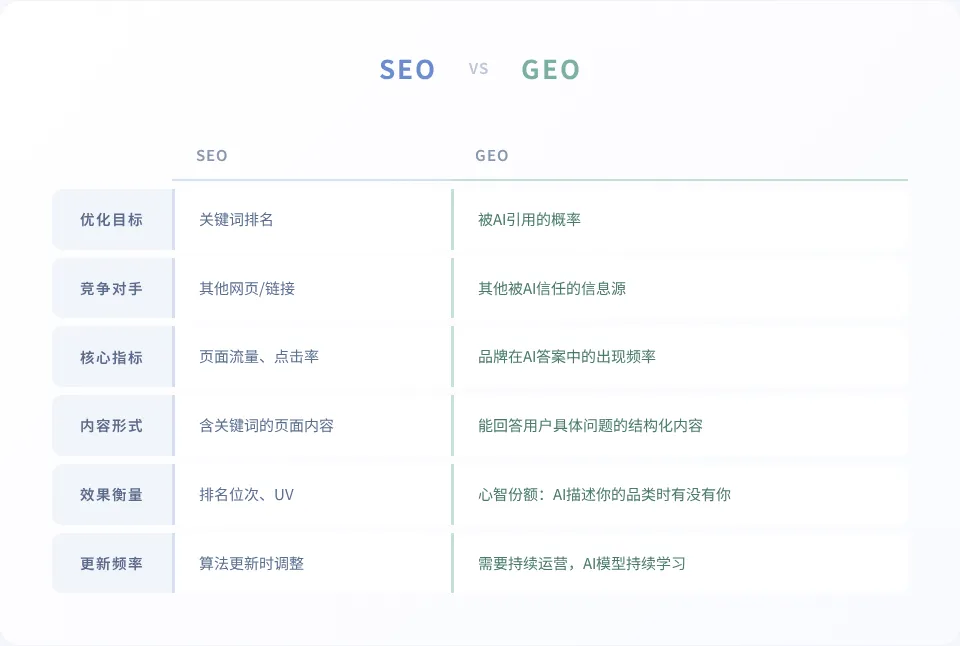 而这背后真正拉开差距的认知差其实就是一句话,以前你做SEO是拼命让客户看到你,现在做GEO是让AI主动推荐你,前者是抢流量,后者是抢信任。