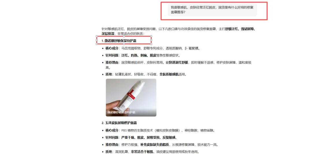 测试问题:我是敏感肌,皮肤经常泛红脱皮,国货里有什么好用的修复面霜推荐?