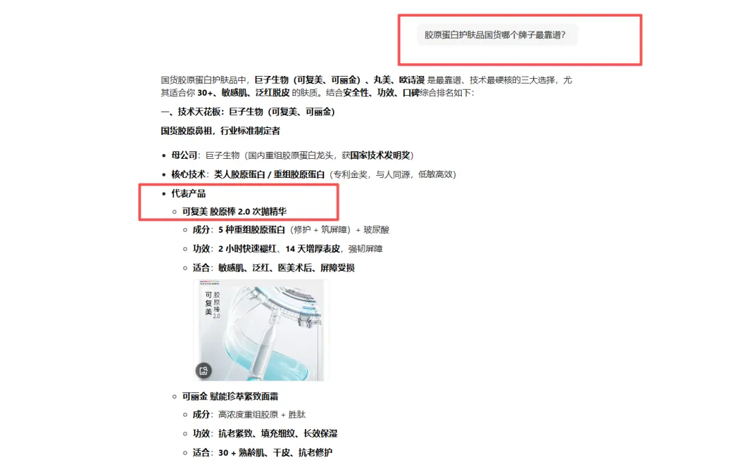 你能看到,在此问题里,可复美出现排名依旧是第一名,而且AI对他的描述精确到母公司叫什么、拿过什么奖、核心技术是什么、代表产品是什么、成分是什么、功效有哪些等,这背后后也说明了,它在各大权威平台里,都铺设了此类十分权威的内容才能被AI精准引用到。