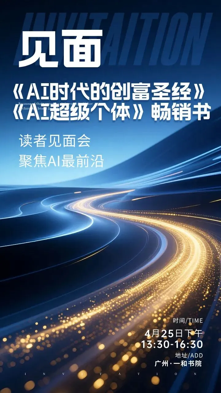 📢 预告:4月29日(周三),广州珠江新城富力盈力大厦,《AI时代的创富圣经》和《AI超级个体》新书读者见面会暨《AI创富密码》训练营第二场沙龙见。