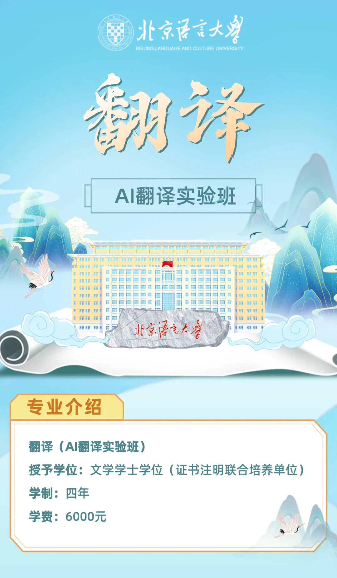 翻译(AI翻译实验班)专业是北京语言大学与北京科技大学联合开设的“翻译+计算机科学与技术”联合学士学位项目,前身为2015年开设的国家级一流本科专业建设点翻译(本地化)专业。本专业响应国家“十五五”规划及信息技术与语言服务融合发展的战略需求,旨在培养具有国际视野、家国情怀、德才兼备的复合型智能语言服务人才。