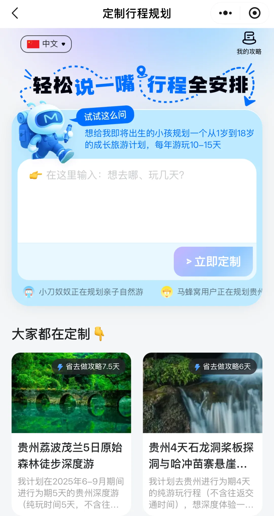 贵州省文旅厅推出的“AI 游贵州”小程序,整合全省9市州文旅资源,综合考量景点关联、交通衔接、游客体力等因素,快速生成最佳路线。无论是亲子游、深度文化游,还是长期成长旅游计划,只需输入需求就能定制专属攻略。