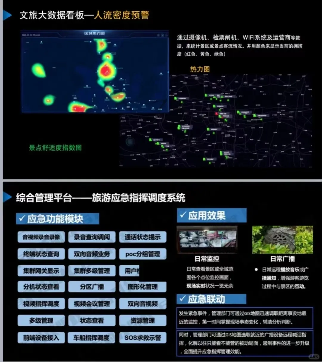 除客流查询外,还覆盖 “吃住行游购娱研” 全服务,含20余项功能。同时,配套的文旅大数据看板和应急指挥调度系统,能实现景区实时监控、远程广播、应急联动,大幅提升景区管理与应急处置能力。
