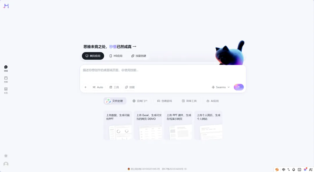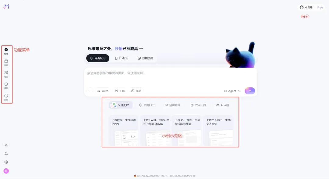 ② 中间的对话输入框这是整个平台的核心!就一个大大的对话框,上面写着类似「告诉我你想做什么」的提示。你的所有创作,都从这里开始。