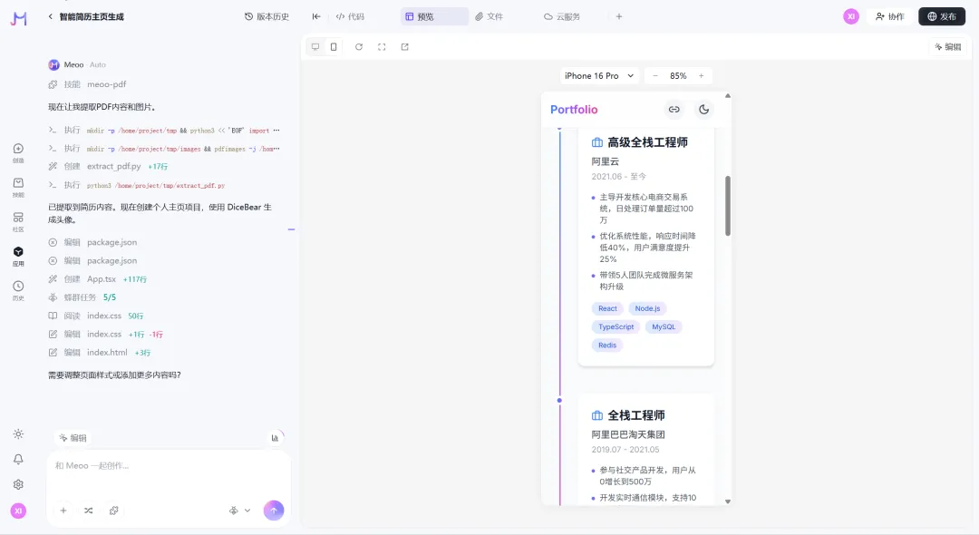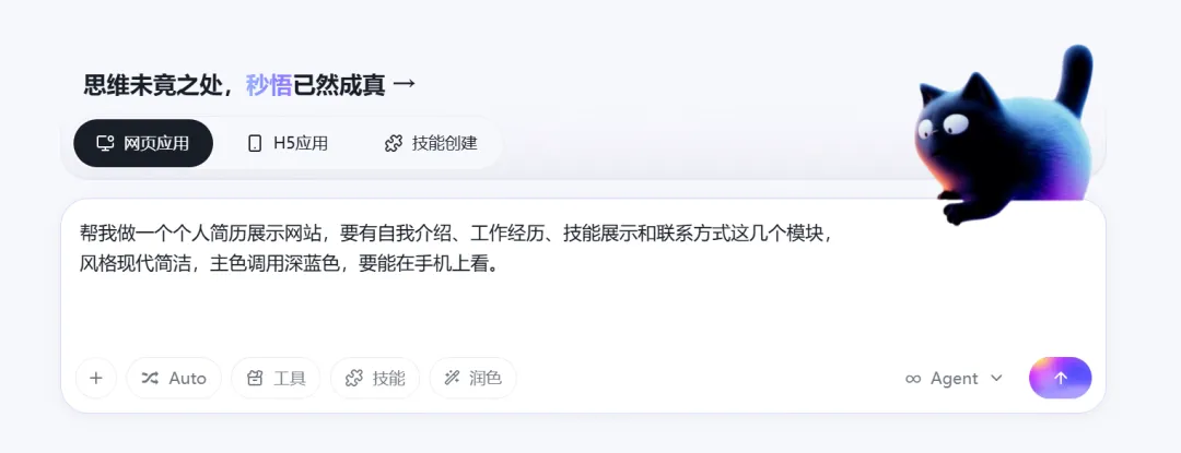 下面我来带你走一遍完整的创作流程。以「创建一个个人简历展示网站」为例,全程只需打字,不用写代码。