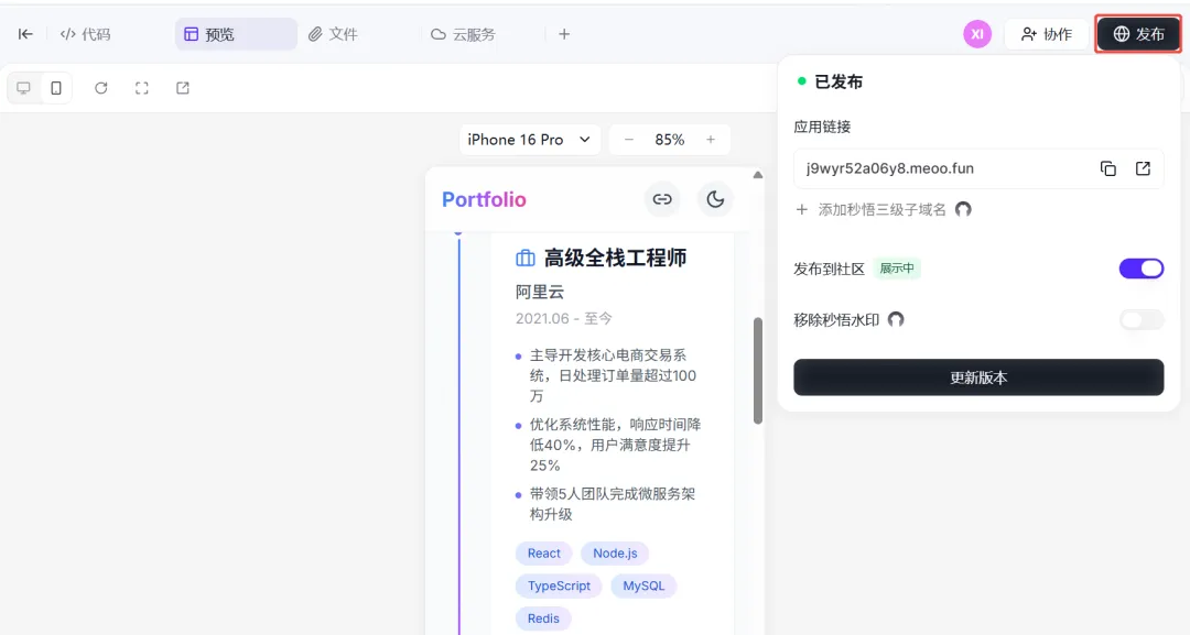 觉得满意了,点击右上角的 「发布」 按钮,几秒钟后你会得到一个独立的网页链接,全球任何人都可以直接访问。