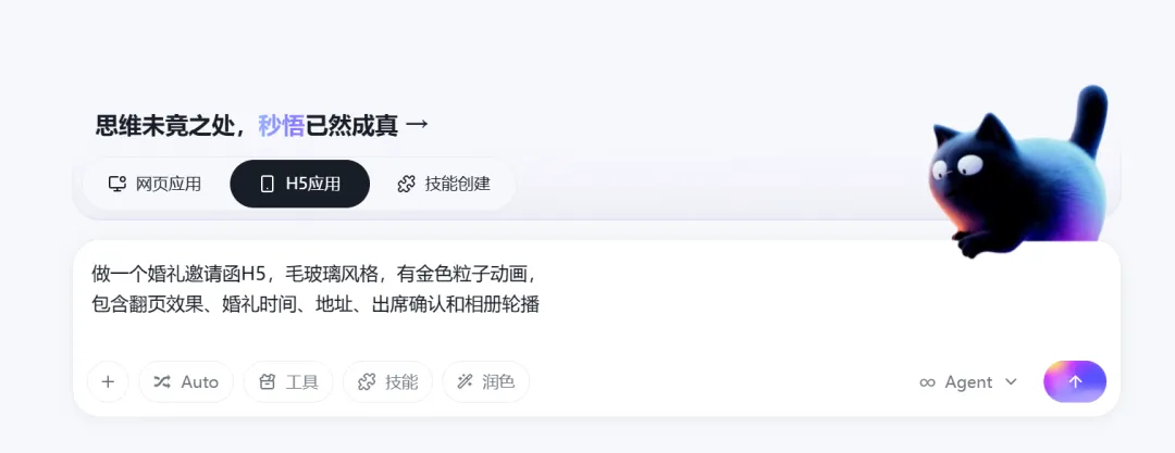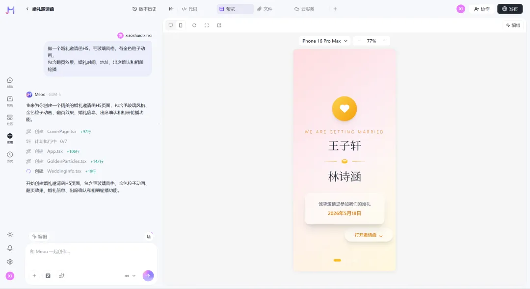 我试了让秒悟做一个婚礼邀请 H5,选用下国内最强的Glm-5模型,输入内容: