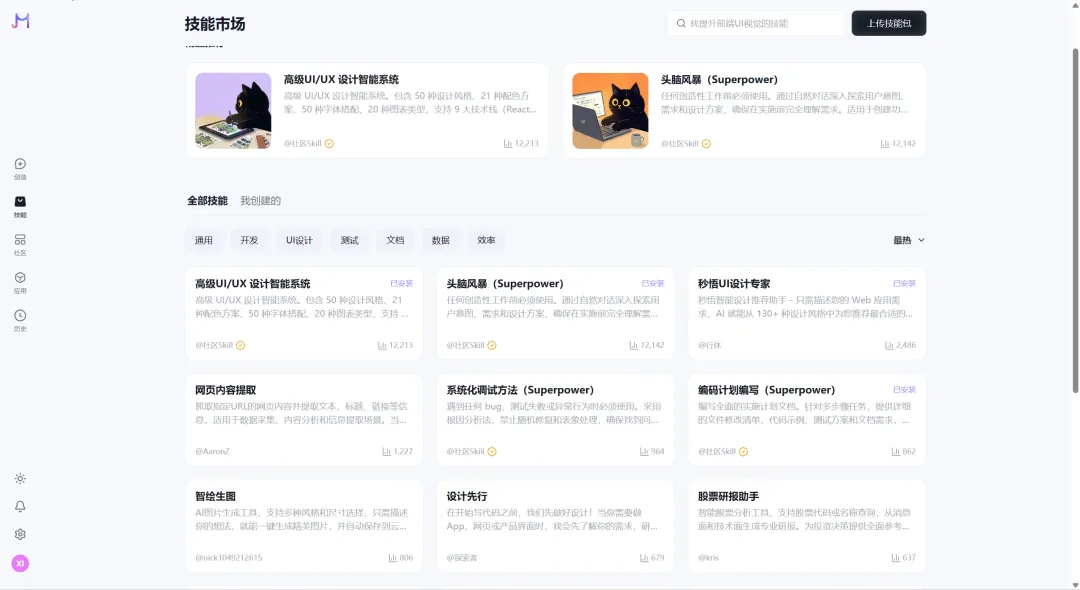 平台内置的 技能市场 还提供了「玻璃拟态UI技能」「游戏音效包」等现成技能包,就像给 AI 装了专属工具箱,能让生成的效果更精准。