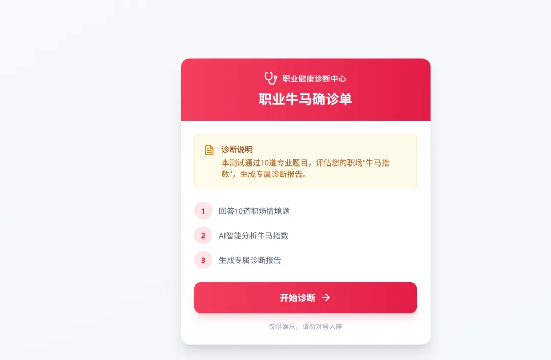 《职业牛马确诊单》H5互动测试应用:https://skpct8omwfdq.meoo.fun