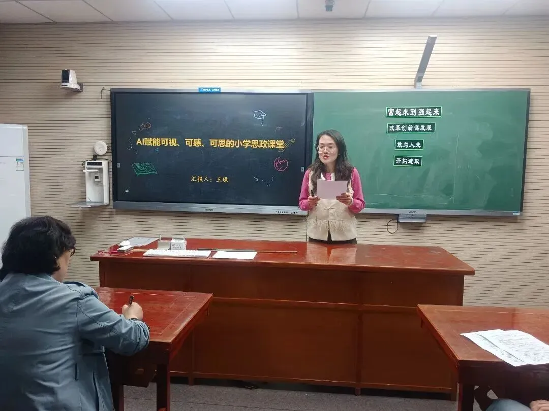 课例展示后,中山路小学的两位骨干教师带来了AI赋能道法课堂的实践分享。王璟老师以《AI赋能可视、可感、可思的思政课堂》为题,分享了如何借助AI技术将抽象的思政知识转化为可视化、可互动的学习资源,打破传统课堂的时空局限,让学生在直观体验中深化理解。