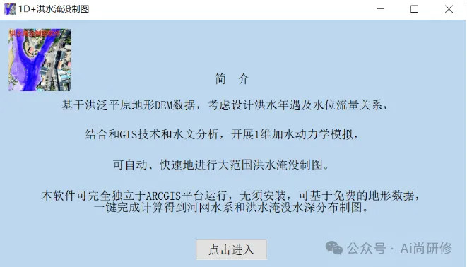 (1)双击进入洪水淹没制图软件V1.0版主体界面(图8),准备好地形数据(ArcGISASCII格式的DEM)后,点击“点击进入”。