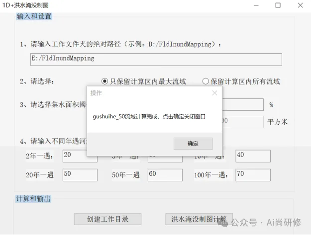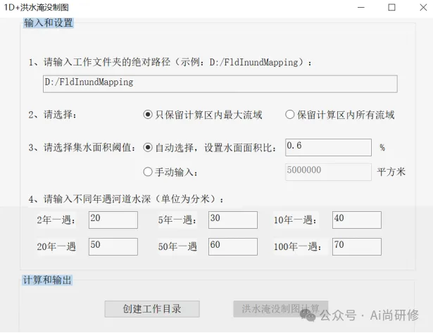(2)点击“点击进入”后软件界面如图9所示。在输入和设置部分依次填写或选择:工作文件夹的绝对路径、是否保留计算区内所有流域、手动输入或自动选择集水面积阈值、不同年遇河道水深(注意单位为0.1米),填写完成后点击“创建工作目录”。