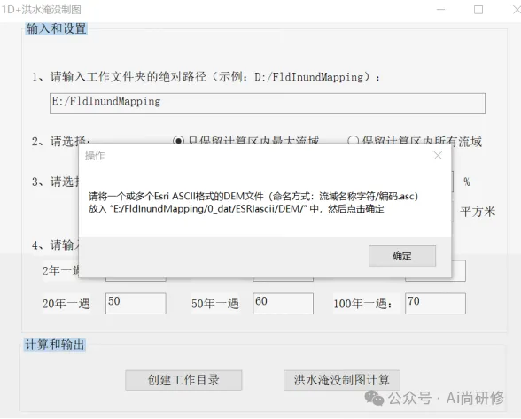 (3)成功创建工作目录后,将一个或多个DEM文件按照提示的命名格式放入指定路径下(图10)。进一步点击“洪水淹没制图计算”,则本软件将对各流域逐一进行淹没模拟和淹没水深制图,当某一个流域计算完成后会出此图11所示提示,点击确定后进行下一个流域计算。