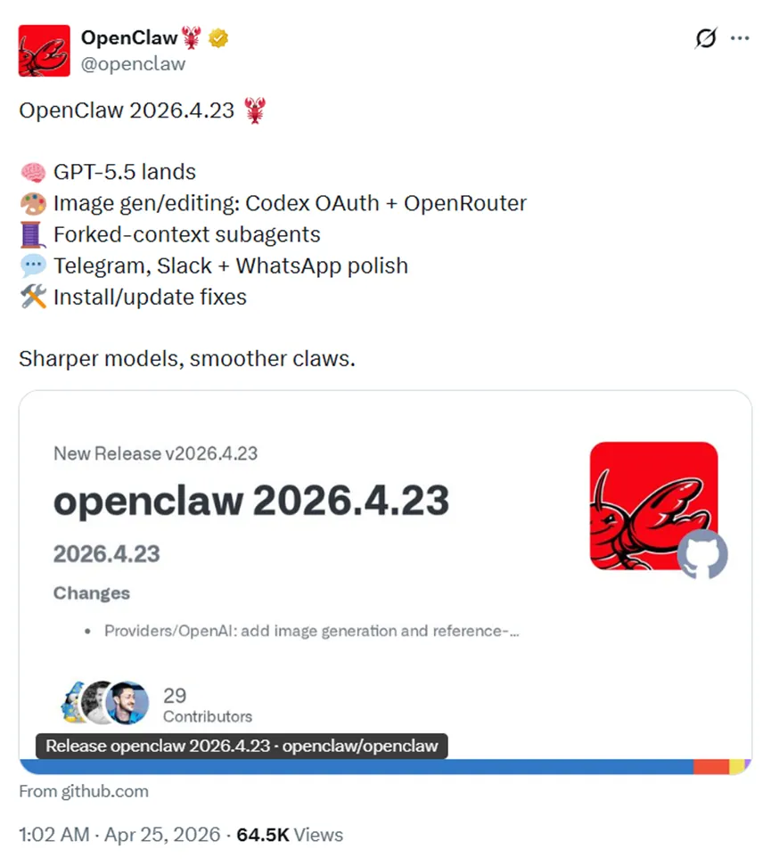 日志地址:https://x.com/openclaw/status/2047722880939511885